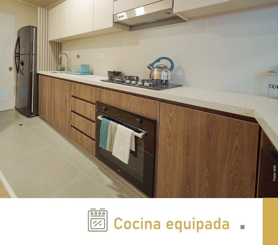 La cocina se entrega equipada con encimera, horno y campana, facilitando tu día a día.